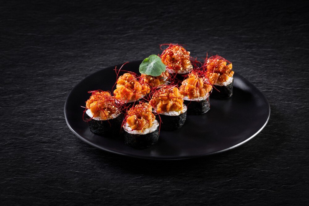 Ryż, nori, ogórek, pieczony łosoś, ser śmietankowy, dynia pieczona, nitki chili