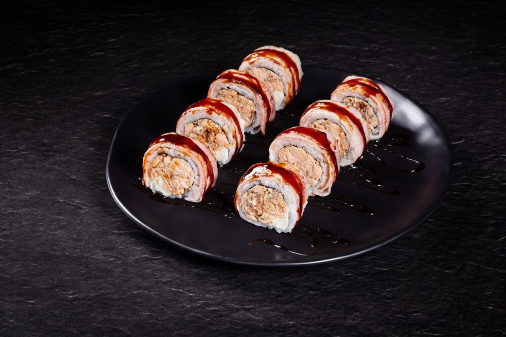 Bekon, grillowany łosoś, ryż, nori, ser.