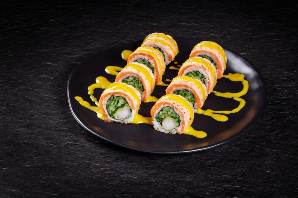 Łosoś opalony, ryż, nori, ogórek, szczypiorek, krewetka tempura.