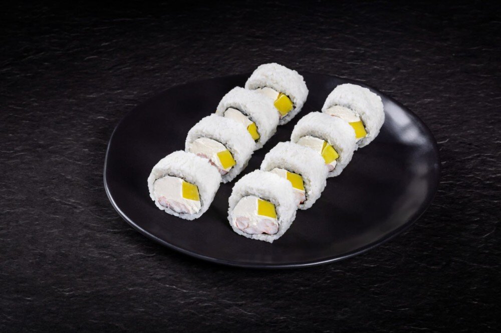 Ryż, nori, ser, mango, krewetka, wierzch kokosowy.