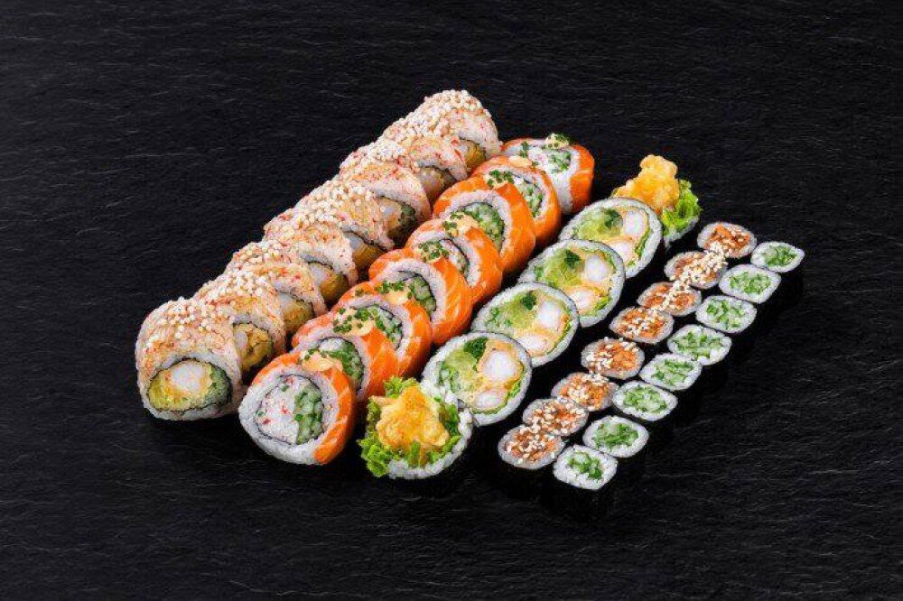 California Crab Salmon - 8szt, Futo krewetka w tempurze - 6 szt, Hoso łosoś pieczony - 8szt, Hoso ogórek - 8szt, California Shrimp - 8szt (razem 38 szt)