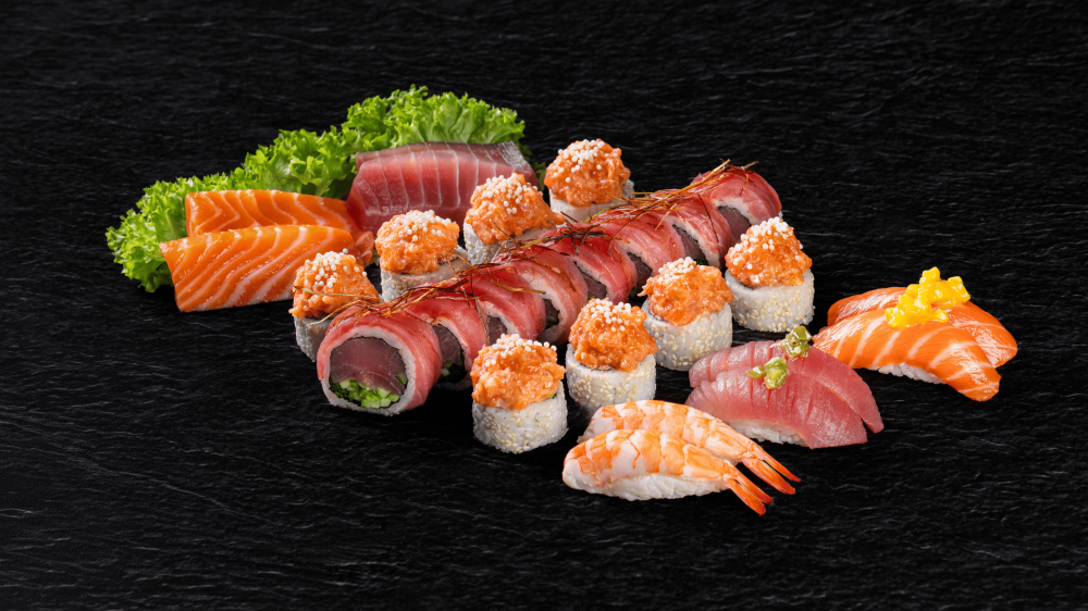 California TATAR Losos PR 8 szt, California Double Tuna PR 8 szt, Nigiri łosoś 2szt, Nigiri Tuńczyk 2szt, Nigiri Krewetka 2szt, Sashimi Łosoś 2szt, Sashimi Tuńczyk 2 szt.