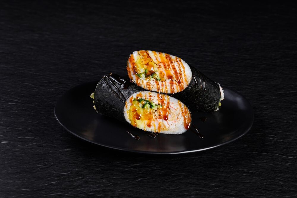 Chrupiąca krewetka w tempurze połączona z delikatnym ryżem, świeżym ogórkiem i sałatą. Całość uzupełniają wyraziste sosy Kobe, Korean BBQ i Unagi, a także aromatyczne nori oraz słodko‑kwaśny takuan. Idealna kompozycja smaków dla miłośników intensywnych, japońskich połączeń.