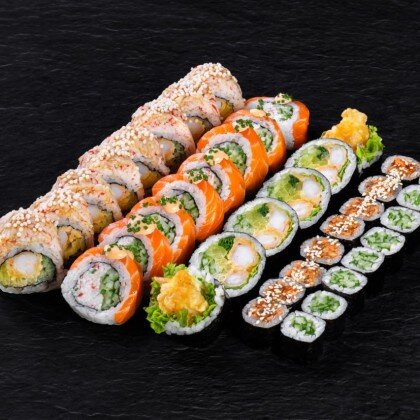 Ryż, nori, ogórek, pieczony łosoś, ser śmietankowy, dynia pieczona, nitki chili