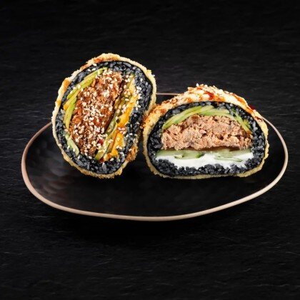 Ryż, serek smietankowy, łosoś pieczony, ogórek, awokado, kanpyo, sos teriyaki